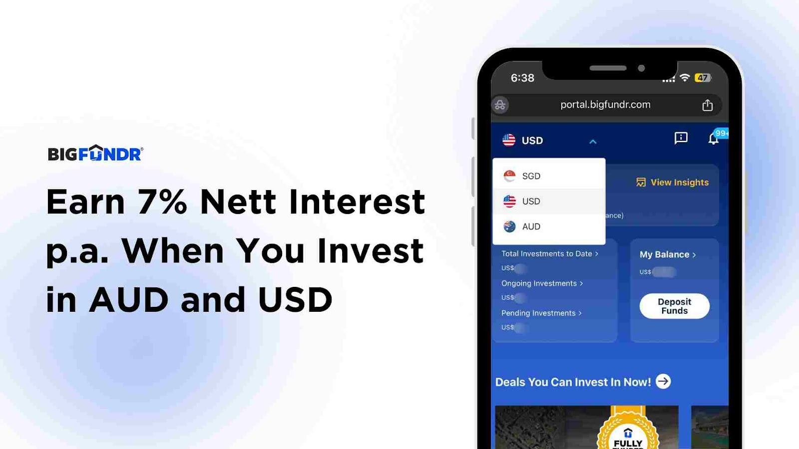 To our investors with holdings in Australian Dollars (AUD) or U.S. Dollars (USD), we are pleased to provide a flat rate of 7% nett interest per annum on Deals you invest in with these currencies. We believe this to be a compelling alternative in a low-yield environment.